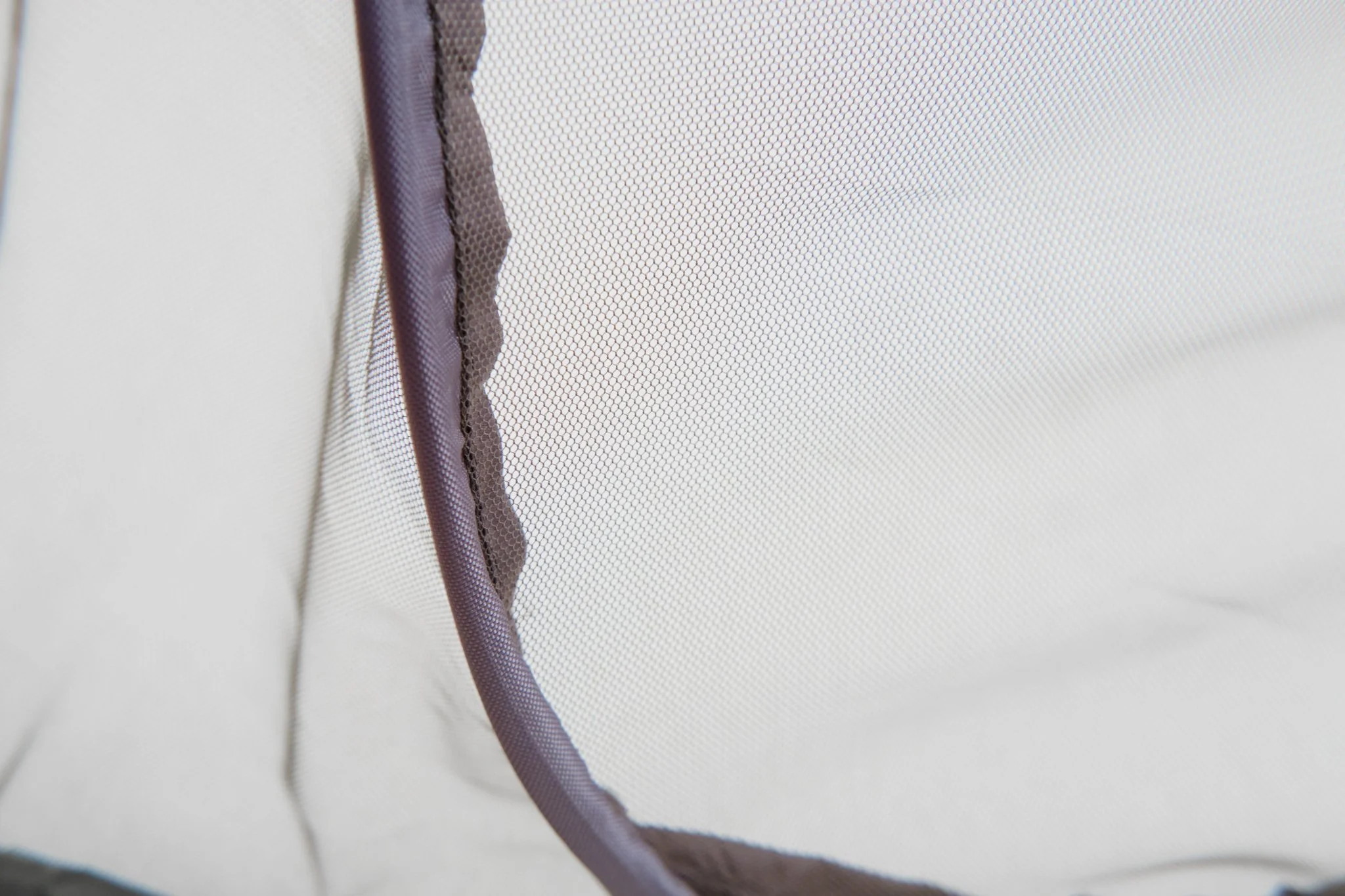 Damit lästige Stechmücken und andere Krabbeltiere nicht stören, gibt es das 3D-Moskitonetz für den Schlafsack, das weltweit erste dreidimensionale Mückenschutznetz. Es wird durch einen kleine Rundbogenstangen über dem Kopf aufgespannt, liegt durch den Popup-Rundbogen nicht am Gesicht auf und schützt so vor den kleinen ungebetenen Gästen. Das kuppelförmige Netz wird mit dem integrierten Reißverschluss am Schlafsack befestigt.
